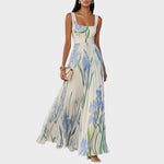 Duga haljina koja spaja romantiku i profinjenost. Četvrtasti izrez sa širokim naramenicama sigurno naglašava dekolte, definirani struk stanjuje figuru, a plisirana suknja daje fluidan pad koji prati svaki korak. Izrađena od laganog, podatnog materijala za cjelodnevnu udobnost, s botaničkim uzorkom koji unosi svjež, chic dojam. Idealna za vjenčanja, večere, putovanja i događaje na otvorenom — look je spreman uz sandale i clutch torbicu.