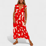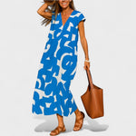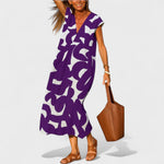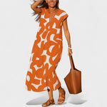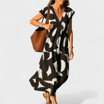 Otkrijte savršenu ravnotežu između umjetničke elegancije i ležerne udobnosti s ovom dugom haljinom ukrašenom jedinstvenim apstraktnim uzorkom. Idealna za vruće ljetne dane, nudi prozračnu prilagodbu i poseban stil u svakoj kombinaciji.