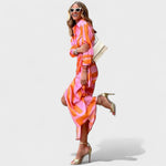 Košulja-kroj s elegantnim ovratnikom i gumbima, lagana i podatna tkanina koja lijepo pada te fluidna silueta s profinjenim prorezom – ova šarena duga haljina stvorena je za trenutni efekt. Suptilno naglašava struk i pruža slobodu kretanja, pa jednako dobro funkcionira u dnevnim kombinacijama i večernjim prilikama.