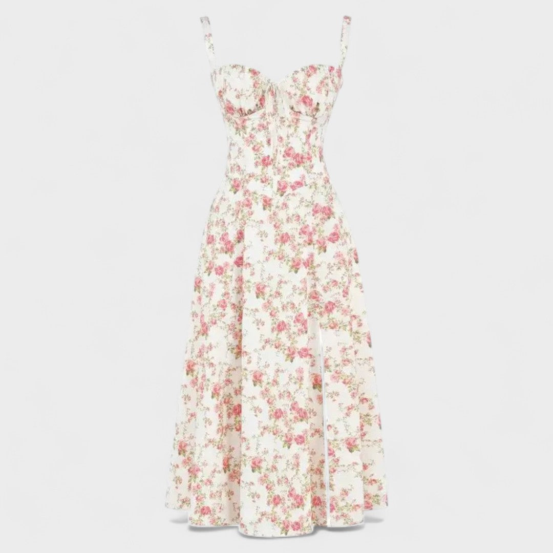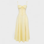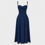 Ova ženstvena midi haljina ističe se savršenim krojem koji naglašava siluetu i pruža profinjen izgled. Elegantni korzetni gornji dio s naramenicama i decentnim detaljima pruža sofisticiran dojam, dok suptilan prorez na donjem dijelu dodaje dašak senzualnosti i slobode pokreta. Idealna je za posebne prilike, večernje izlaske ili romantične trenutke u kojima želite zablistati.
