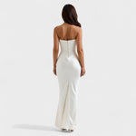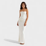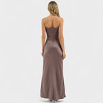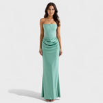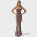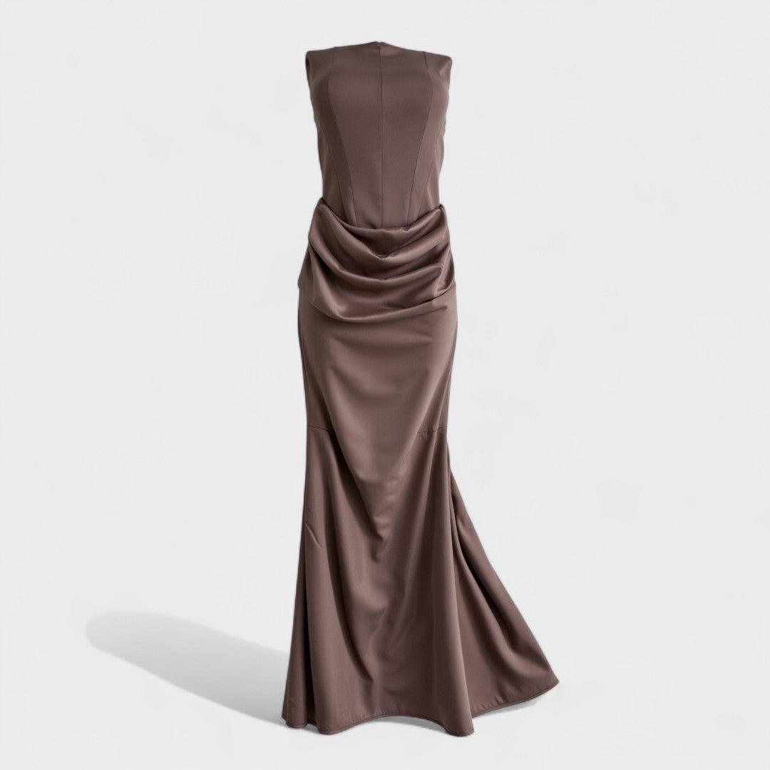 Haljina 'Radmila' predstavlja privremenu eleganciju u svom najljepšem izdanju. Ova haljina koja seže do poda ima bustier stil bez naramenica, izrađen od mat materijala koji pruža savršenu osnovu, dok umjetnički nabor u području bokova stvara zavidne oblike. Prilagođeni silueta prelazi u suptilno širenje ribljeg repa od sjajnog satena, koje svaki korak čini posebnim.