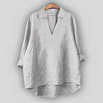Elegantna lanena bluza koja isijava minimalističku eleganciju i bezvremenski stil. Duboki V izrez s elegantnim ovratnikom daje modernu liniju, dok labavi kroj osigurava udobnost i lakoću pokreta. Asimetrični završetak s dužim stražnjim dijelom upotpunjuje elegantnu estetiku.