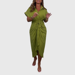 Ova haljina spaja klasičnu eleganciju i moderan dizajn. Košulja-kroj s ovratnikom i gumbima u kombinaciji s efektnim vezanjem u struku stvara laskavu siluetu i ističe ženstvenost. Mekani materijal pruža udobnost, a midi dužina čini je savršenim izborom za poslovne prilike, večernje izlaske ili svečane događaje.
