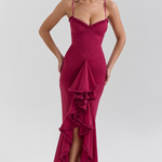 Impresivna i ženstvena haljina s prilagođenim krojem koja oblikuje tijelo i ističe siluetu. Detalji s volanima na dekolteu i suknji donose dašak romantike i elegancije. Idealna za večernje izlaske i posebne prigode kada želite biti u središtu pažnje.