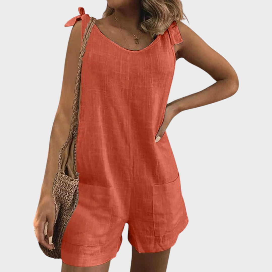 Ovaj lagani kombinezon savršen je izbor za tople dane i opuštene prilike. S modernim krojem bez rukava, praktičnim džepovima i ženstvenim vezanjem na ramenima, donosi spoj udobnosti i stila koji će vas pratiti od jutra do večeri.