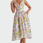 Ženska i elegantna haljina s cvjetnim uzorkom koja isijava romantiku. Prilagođeni korzet i lepršava midi suknja stvaraju siluetu koja laskava svakom obliku tijela. Idealna za ljetne izlaske, vjenčanja i posebne prigode.