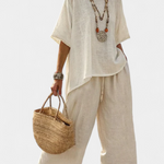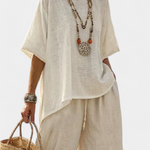Čista jednostavnost s prirodnom elegancijom. Set Daisy se ističe svojom ležernom i monokromatskom siluetom, idealan za one koji traže udobnost i čisti stil. Izrađen od laganog materijala, ovaj izgled prati svaki pokret s svježinom i elegantnom ležernošću.