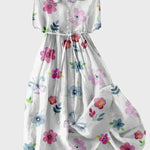 Ova slatka maxi haljina isijava proljetnu i razigranu atmosferu, s bijelom podlogom koja se ističe šarenim cvjetnim uzorcima i diskretnim leptirima. Njezina udobna kroja i lagana tekstura čine je idealnom za svakodnevne izlaske i opuštene šetnje.