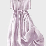 Ova nježna ljubičasta haljina isijava eleganciju i romantiku, idealna za svaku ženu koja želi istaknuti svoj stil s bezvremenskim izgledom. Minimalistički kroj naglašava ženstvenost, dok pojas u struku suptilno ističe oblik tijela.