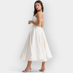 Jednostavna i elegantna, ova haljina isijava bezvremensku sofisticiranost i nenametljivu ženstvenost. Njezin fluidni kroj grli tijelo s gracioznošću, nudeći udobnost i stil u svakoj prilici.