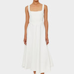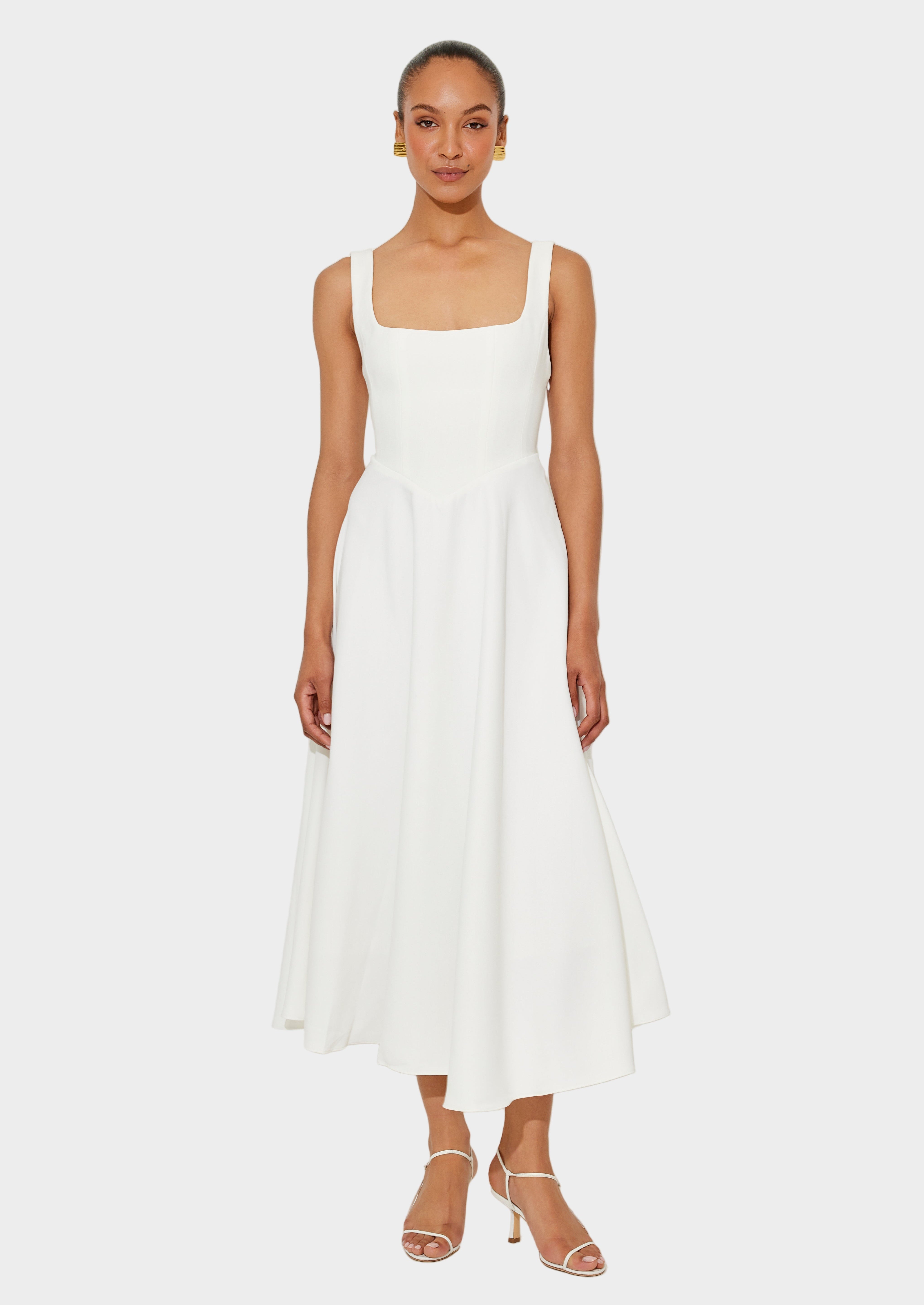 Izdignite svoju eleganciju i vječnost s ovom bijelom midi haljinom u minimalističkom stilu. Njezina čista dizajnerska linija, u kombinaciji s izvrsnim krojem, čini je idealnim izborom za službene i poluslužbene prilike.
