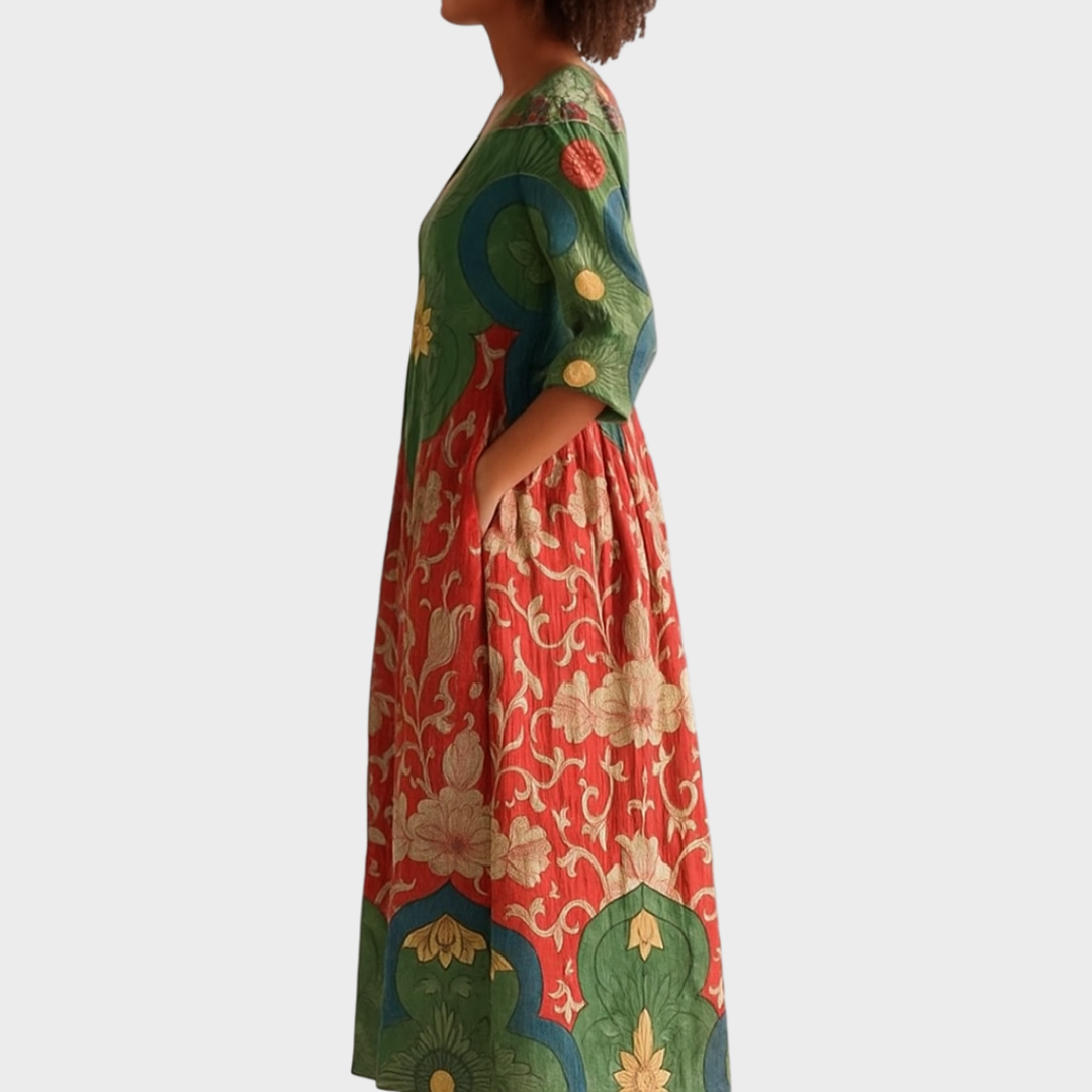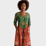 Ova haljina spaja umjetnički dizajn i udobnost u savršenoj ravnoteži. S bogatim etno uzorkom, V-izrezom i praktičnim džepovima, idealna je za žene koje vole originalnost i slobodu u odijevanju. Lepršavi kroj omogućuje lakoću kretanja, a upečatljivi detalji daju poseban šarm svakoj prilici.
